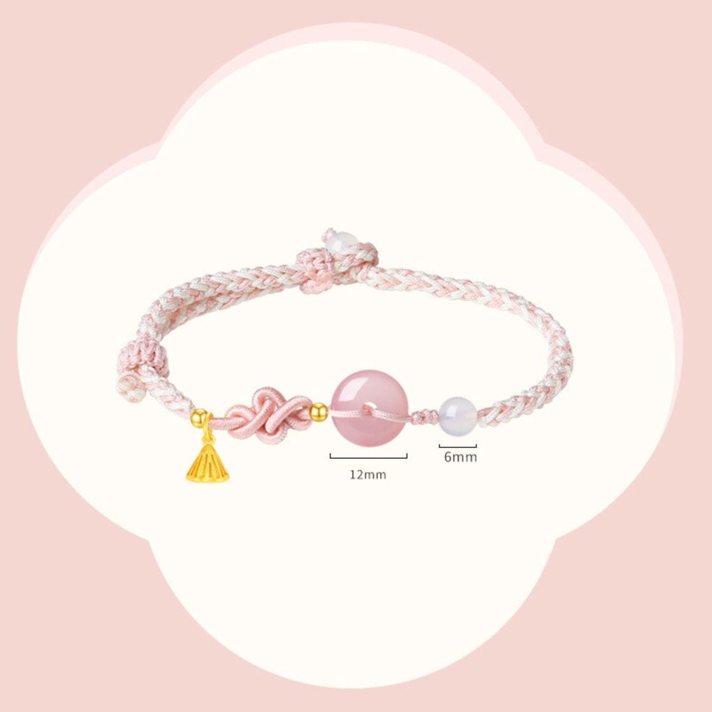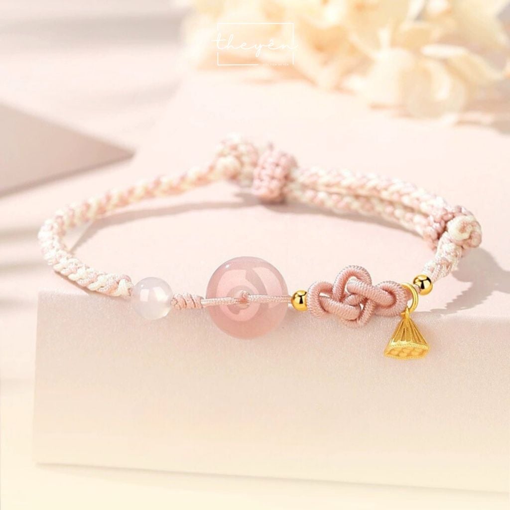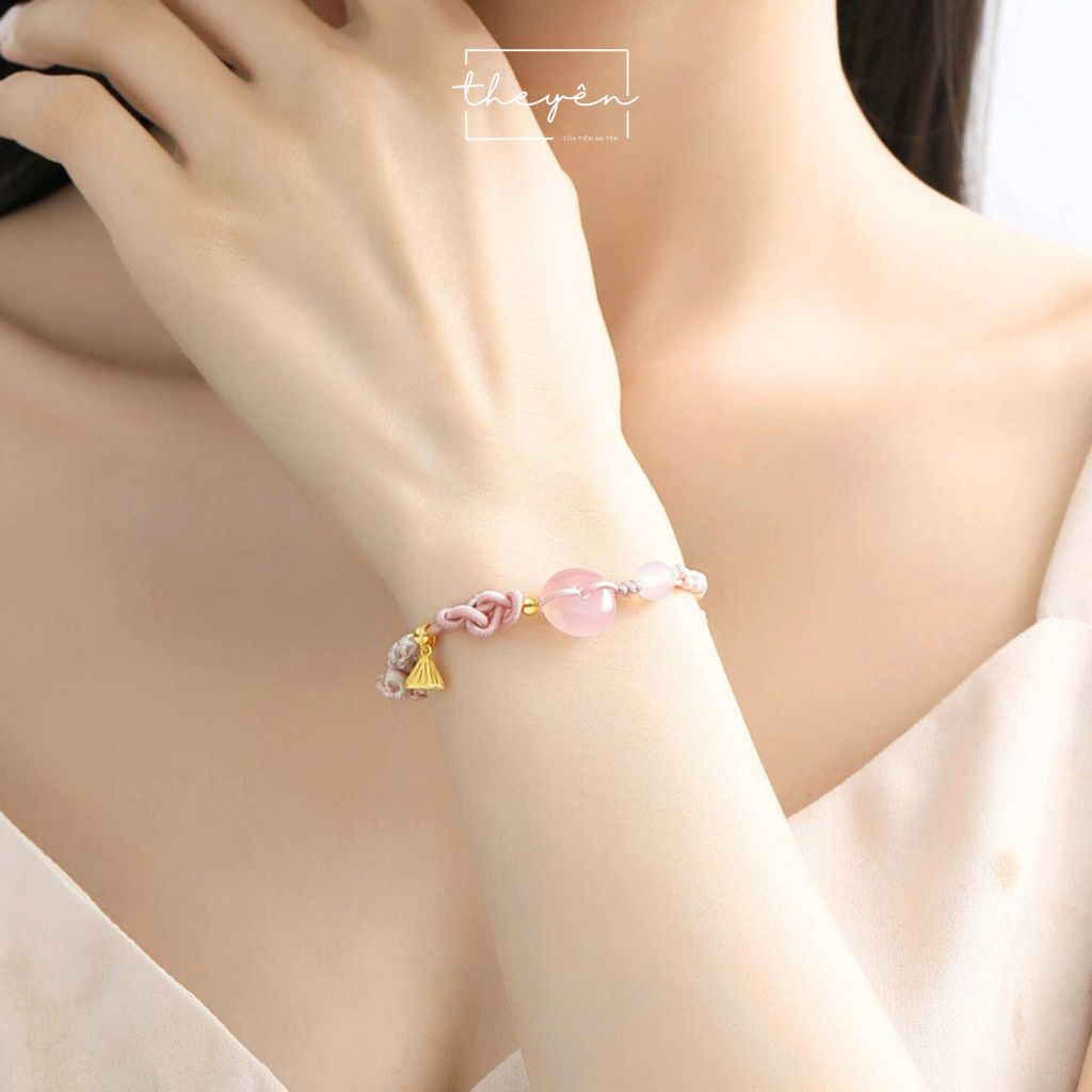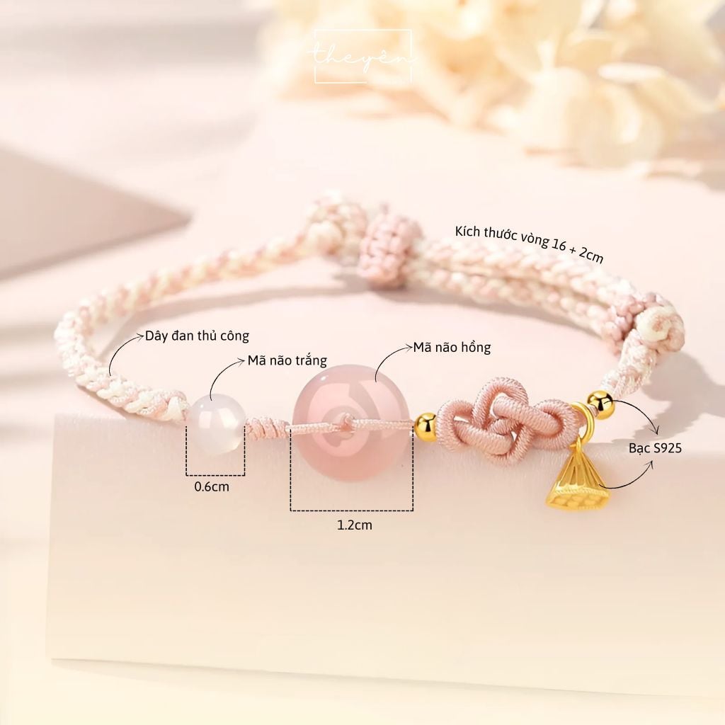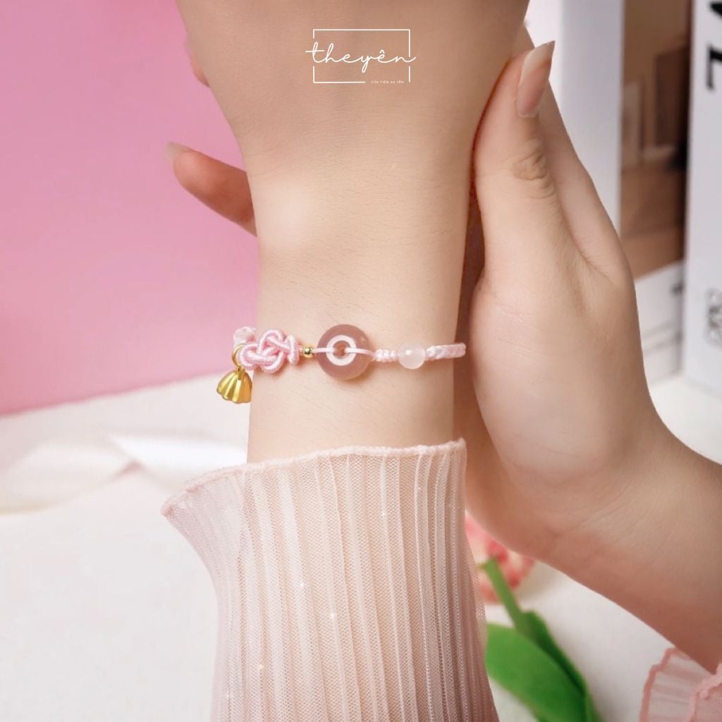Bên cạnh đó, Yên Nhiên còn được trang trí bằng một chiếc charm nút thắt cát tường được chế tác thủ công tỉ mỉ. Đây là biểu tượng của sự kết nối và may mắn, gợi nhắc về những điều tốt đẹp và bền chặt trong cuộc sống. Các chi tiết nhỏ như hạt đá lấp lánh và charm hoa sen được thêm vào để tạo điểm nhấn, giúp chiếc vòng trở nên tinh tế và cuốn hút hơn.
