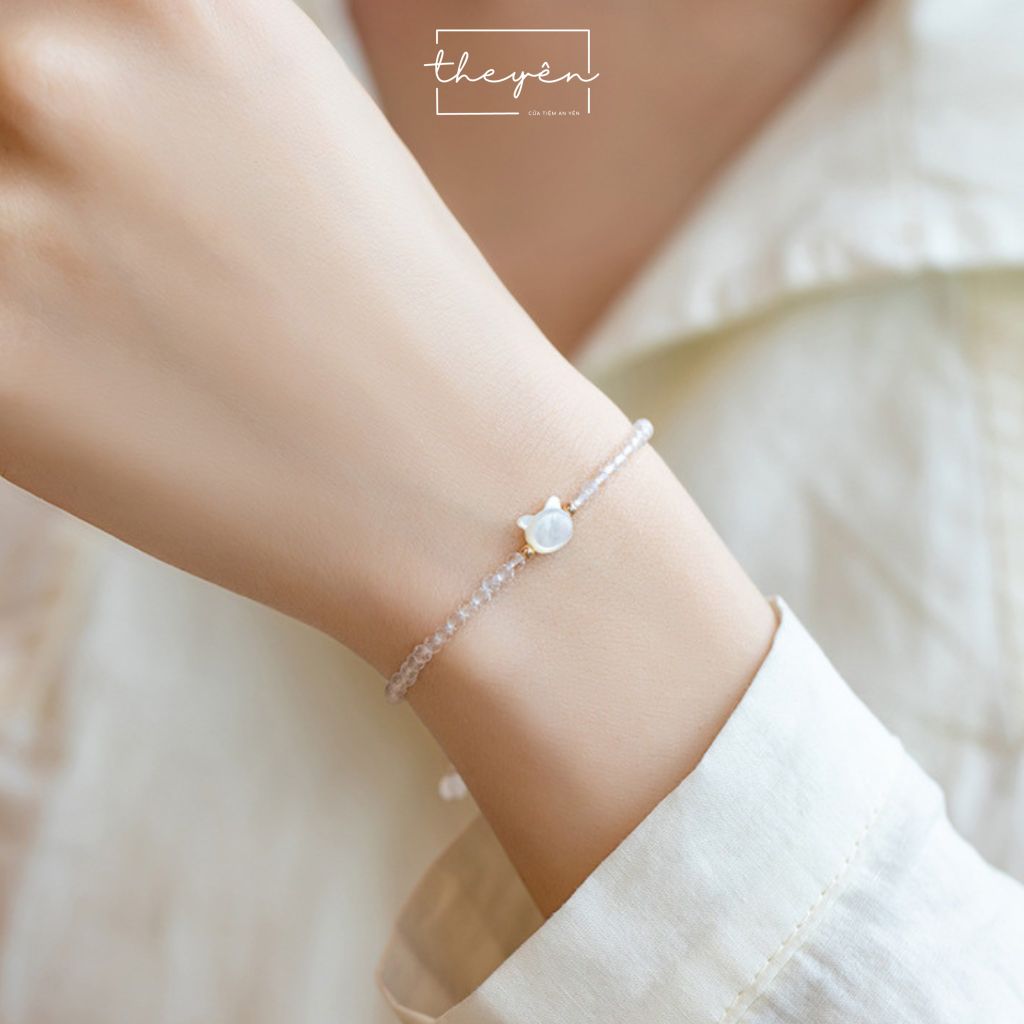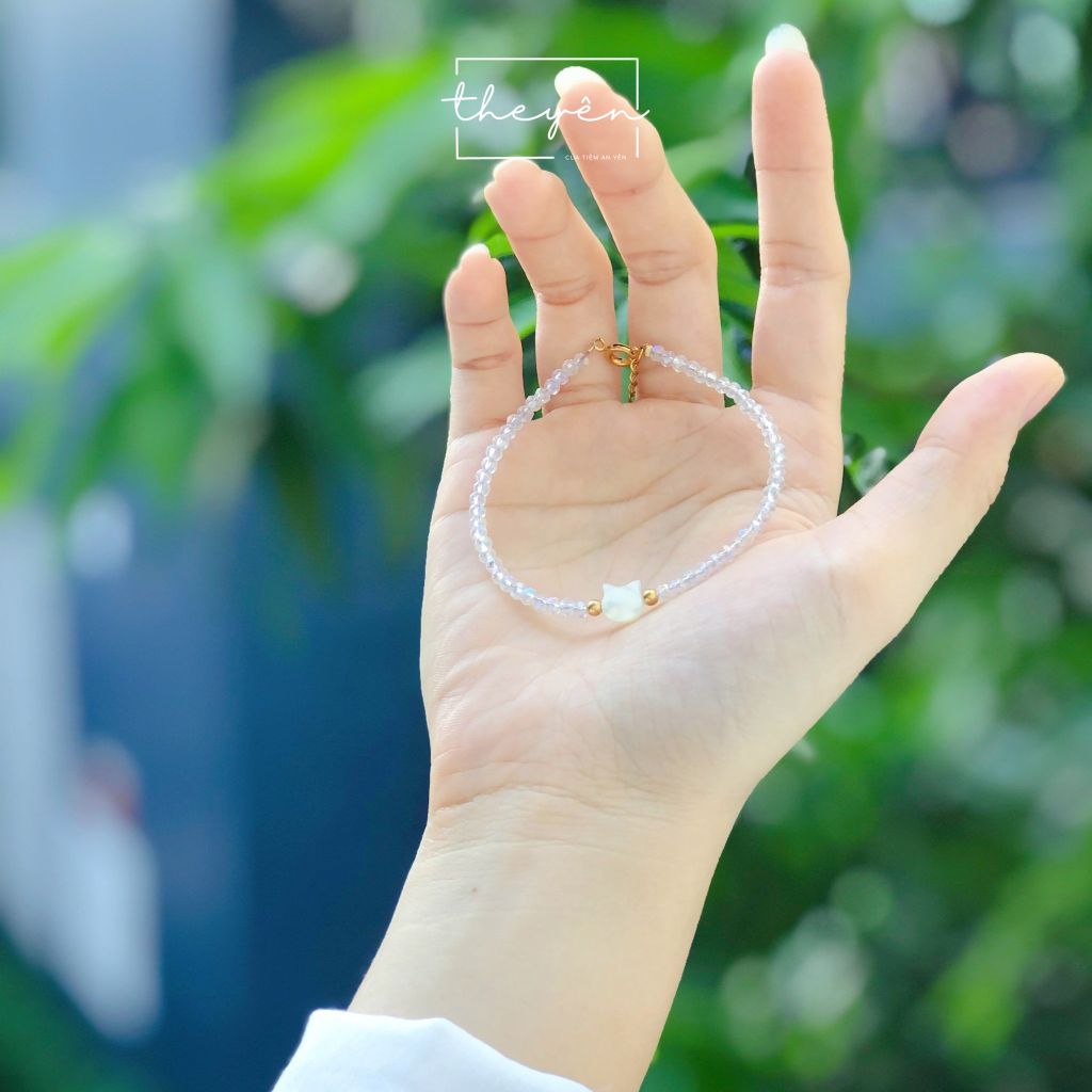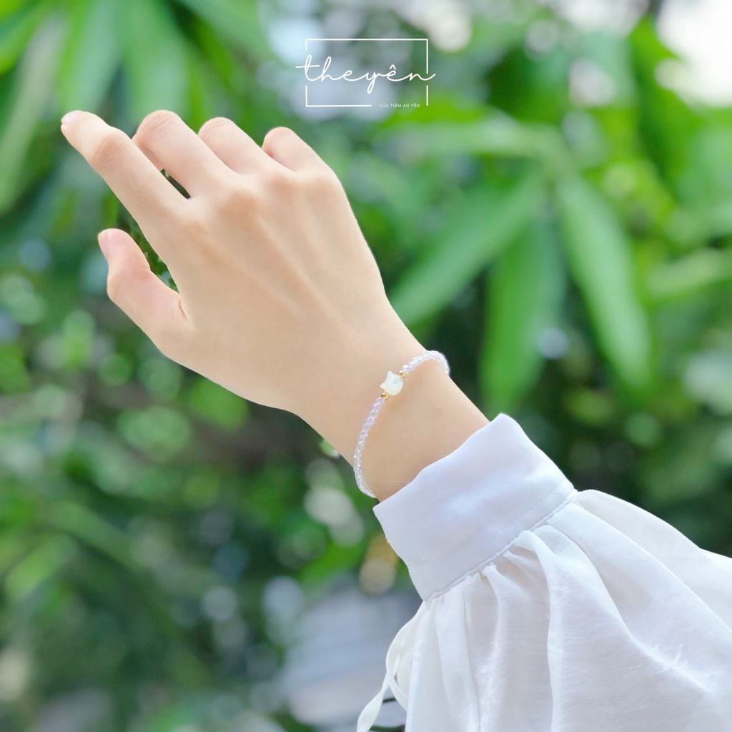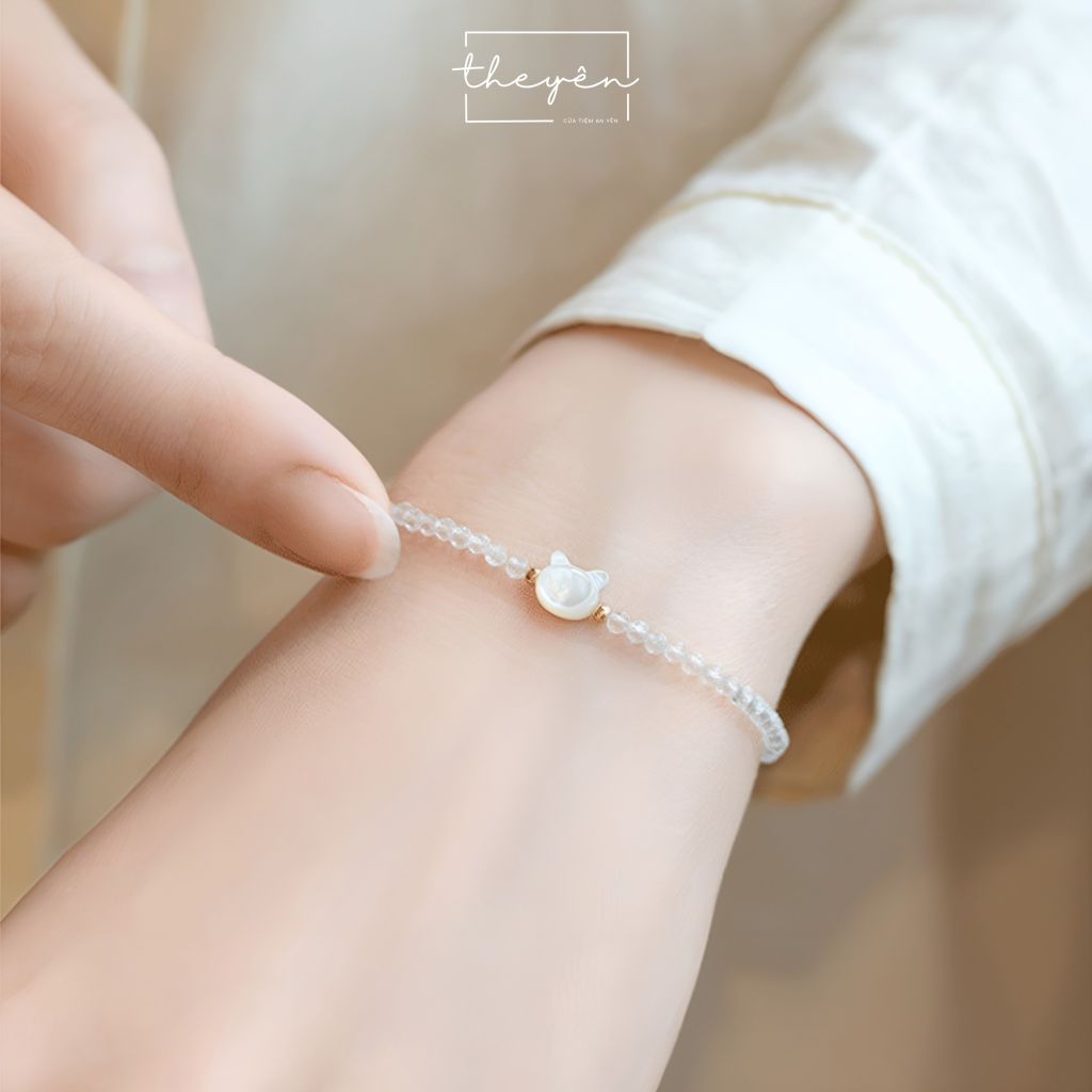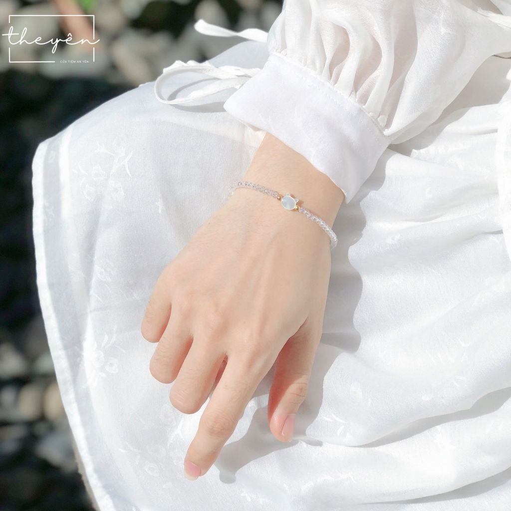 Được chế tác từ những hạt pha lê trắng trong suốt, tượng trưng cho vẻ đẹp thuần khiết. Điểm nhấn là chiếc charm mèo trắng được chạm khắc tỉ mỉ từ vỏ sò sáng bóng tạo nên sự hài hòa giữa nét tinh tế, mềm mại và sự sang trọng.
