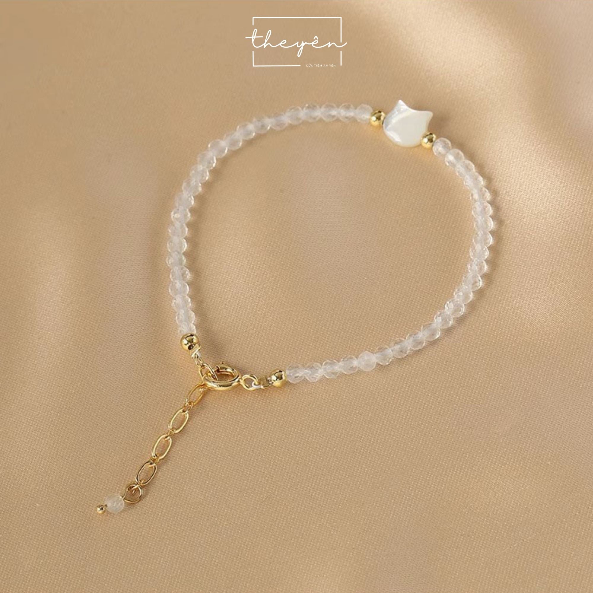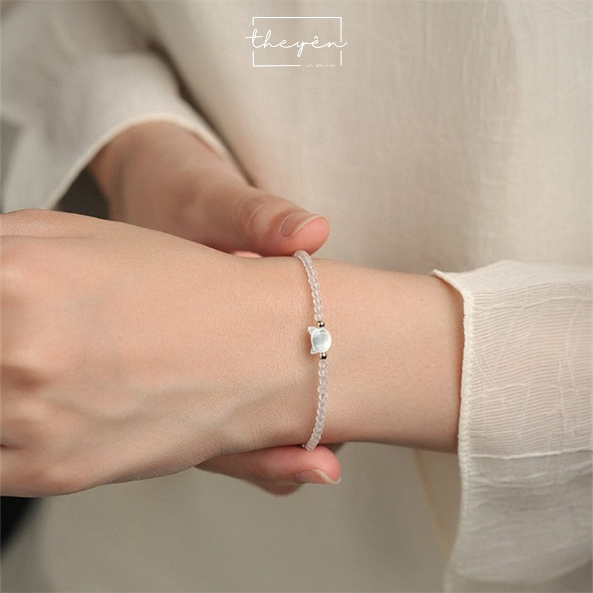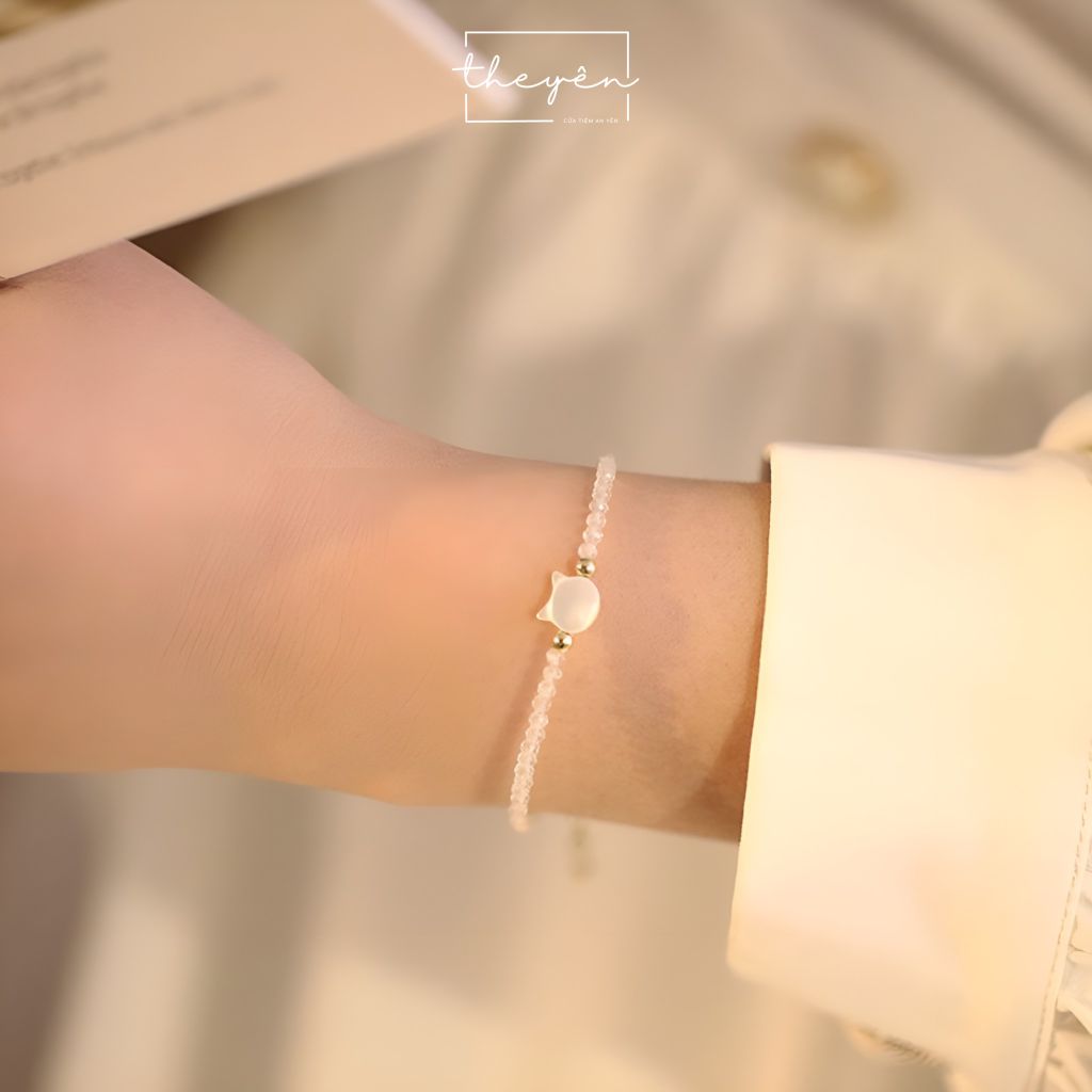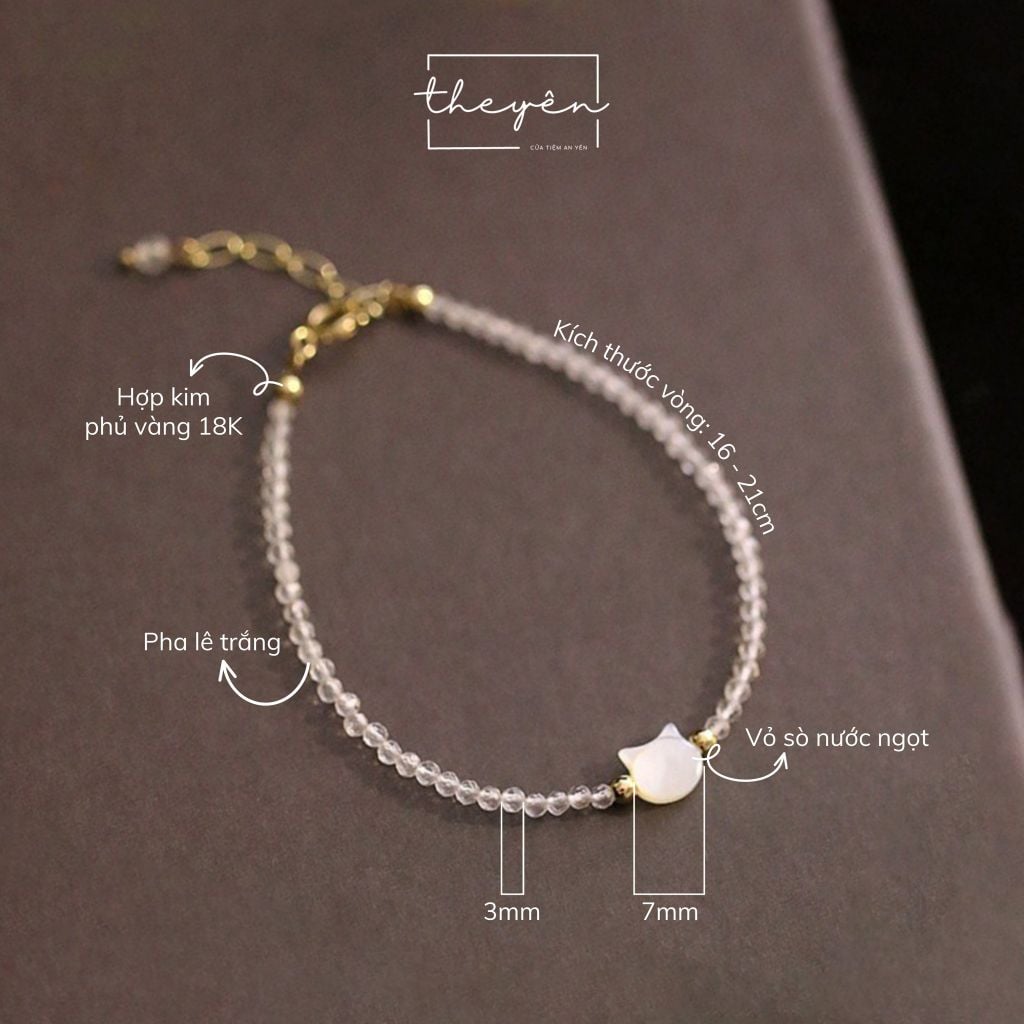 Được chế tác từ những hạt pha lê trắng trong suốt, tượng trưng cho vẻ đẹp thuần khiết. Điểm nhấn là chiếc charm mèo trắng được chạm khắc tỉ mỉ từ vỏ sò sáng bóng tạo nên sự hài hòa giữa nét tinh tế, mềm mại và sự sang trọng.