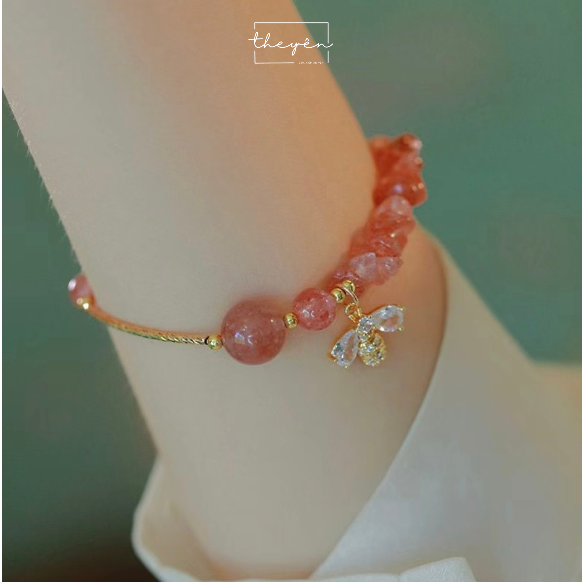 Bên cạnh đó, charm chú ong nhỏ bằng đá Zircon lung linh, lấp lánh như đôi cánh trong suốt, khẽ rung giữa bầu trời hồng phấn. Biểu tượng ong, qua bao nền văn hoá vẫn mãi gợi lên sức sống, lòng kiên trì và niềm tin rằng từ những điều bé nhỏ, sự ngọt ngào có thể được sinh thành. (^^)